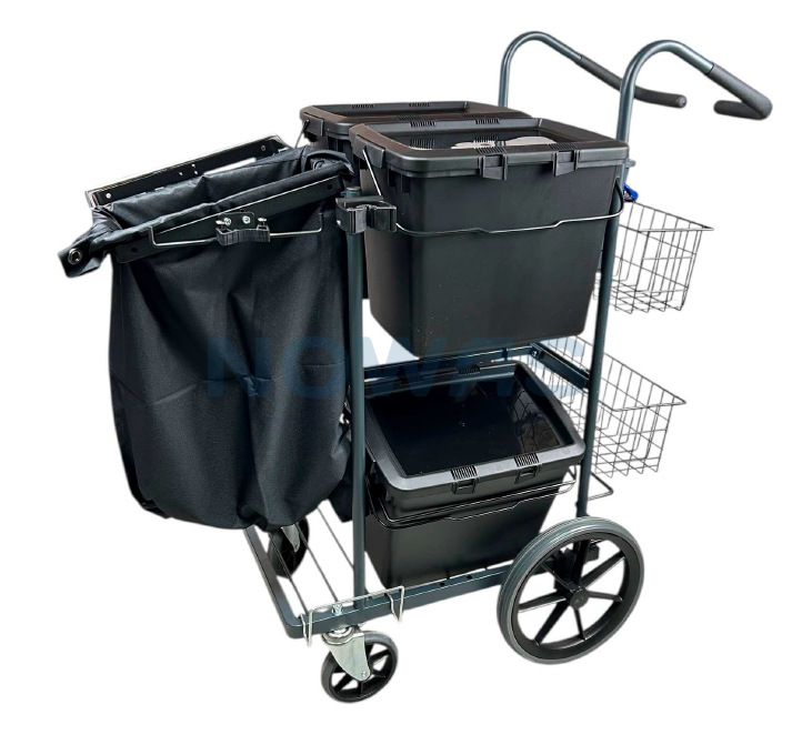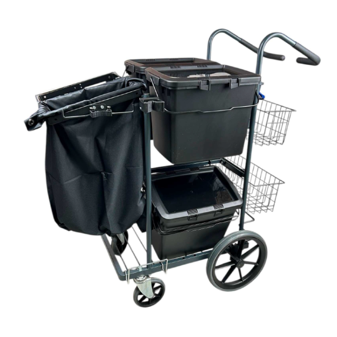 Denna servicevagn är en utomhusvagn med gott om förvaringsutrymme i både hinkar och korgar.