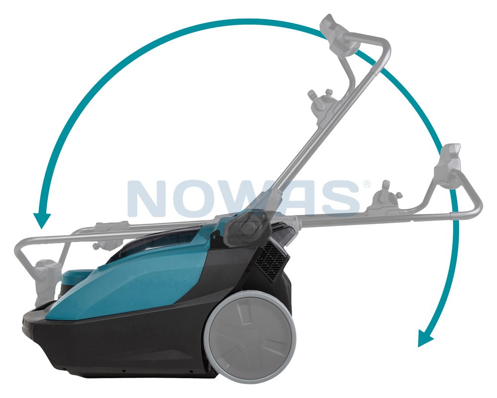 Sopmaskin för både inomhus- och utomhusbruk. Utrustad med HEPA-filter och automatisk filterrengöring. 2 stycken motroterande huvudborstar möjliggör effektiv upptagning av större föremål. Den totala sopbredden är 65 cm. Det är möjligt att köpa en extra påse med en kapacitet på 47 liter. Sopmaskinen kan fällas ihop och förvaras i vertikalt läge. Levereras utan batteri och laddare.