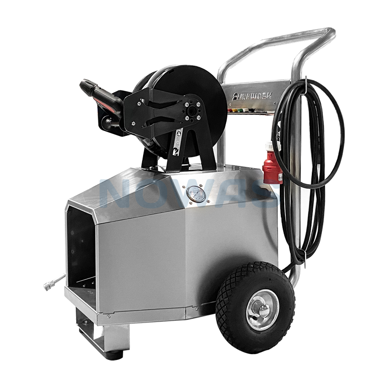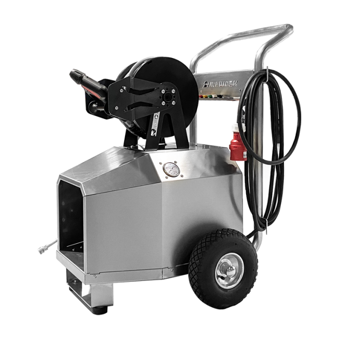 Denna mobila kallvattentvätt PE200/15 är en robust högtryckstvätt i rostfritt stål, avsedd för industriellt bruk.