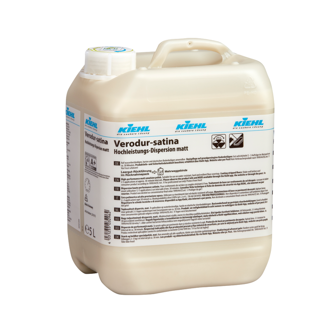 Verodur-satina är en högpresterande, matt emulsionspolish för skydd och vård av golv.
