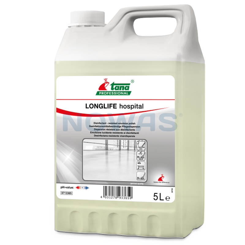 Tana LONGLIFE Hospital polish är ett alkohol- och desinfektionsbeständigt golvpolish för sjukhus. Denna utmärkta polish säkerställer en glänsande, hållbar och halkfri yta. Tana LONGLIFE Hospital används på alla golv som kräver alkohol- och desinfektionsbeständighet (med undantag för obehandlade trägolv).