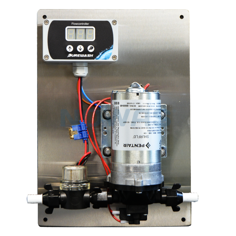 Smart och användbar uppsättning med pump och flödesregulator monterat på en platta. Klar att ansluta.