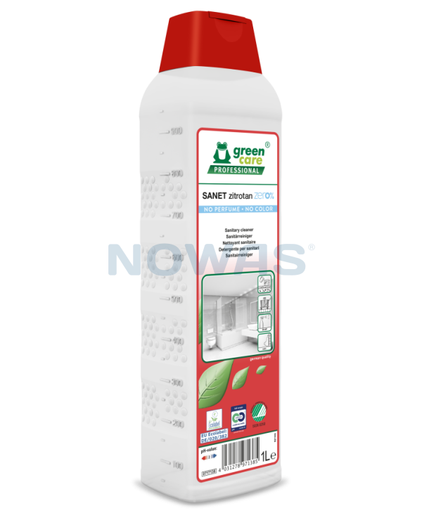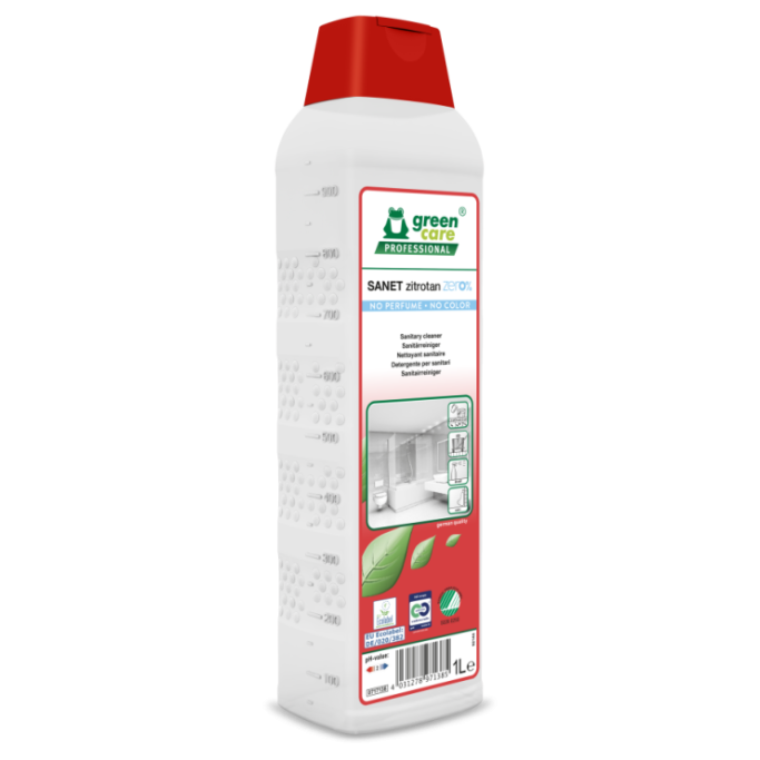 SANET Zitrotan Zero% är ett surt sanitetsrengöringsmedel som inte innehåller några färgämnen eller parfym. Med respekt för det biologiska kretsloppet tar produkten hänsyn till människors hälsa och städpersonalens säkerhet.