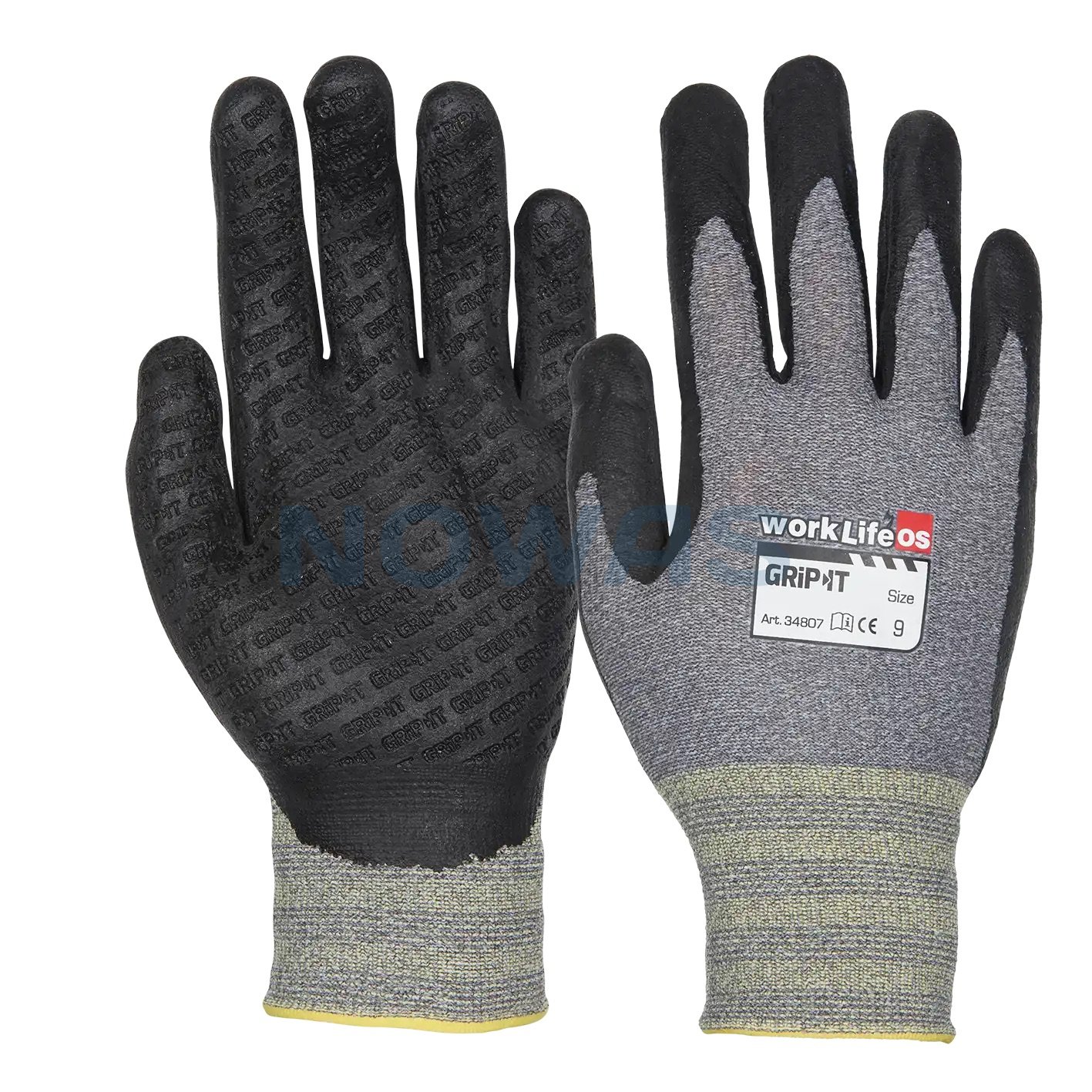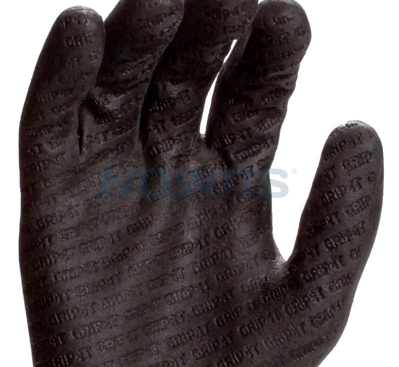 Worklife Grip-It är en sömlös handske gjord av gråmelerad nylon/polyester, med halvdoppad präglad svart nitrilskumbeläggning i handflatan för bättre grepp.