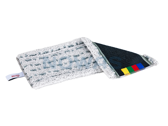- Kantsydd och stark kardborre. Ger stabilitet åt moppen så att den ligger platt på golvet, vilket gör det lättare att ta på och av moppen. Mataren är ordentligt fäst vid moppen under hela rengöringsprocessen. Minimerar partikelläckage.