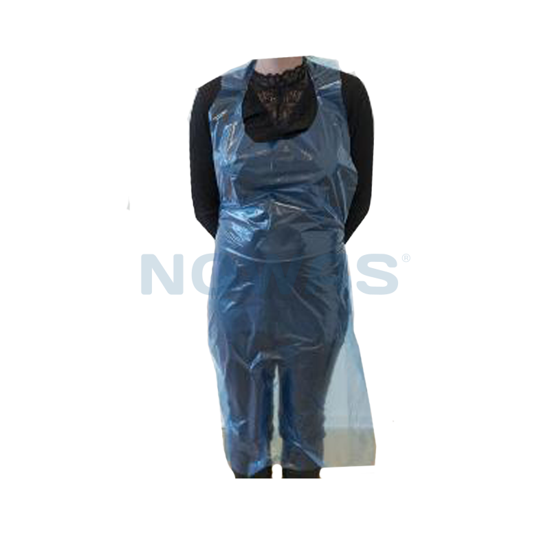 Engångsförkläde i plast med stängt band runt halsen och knytband på ryggen.