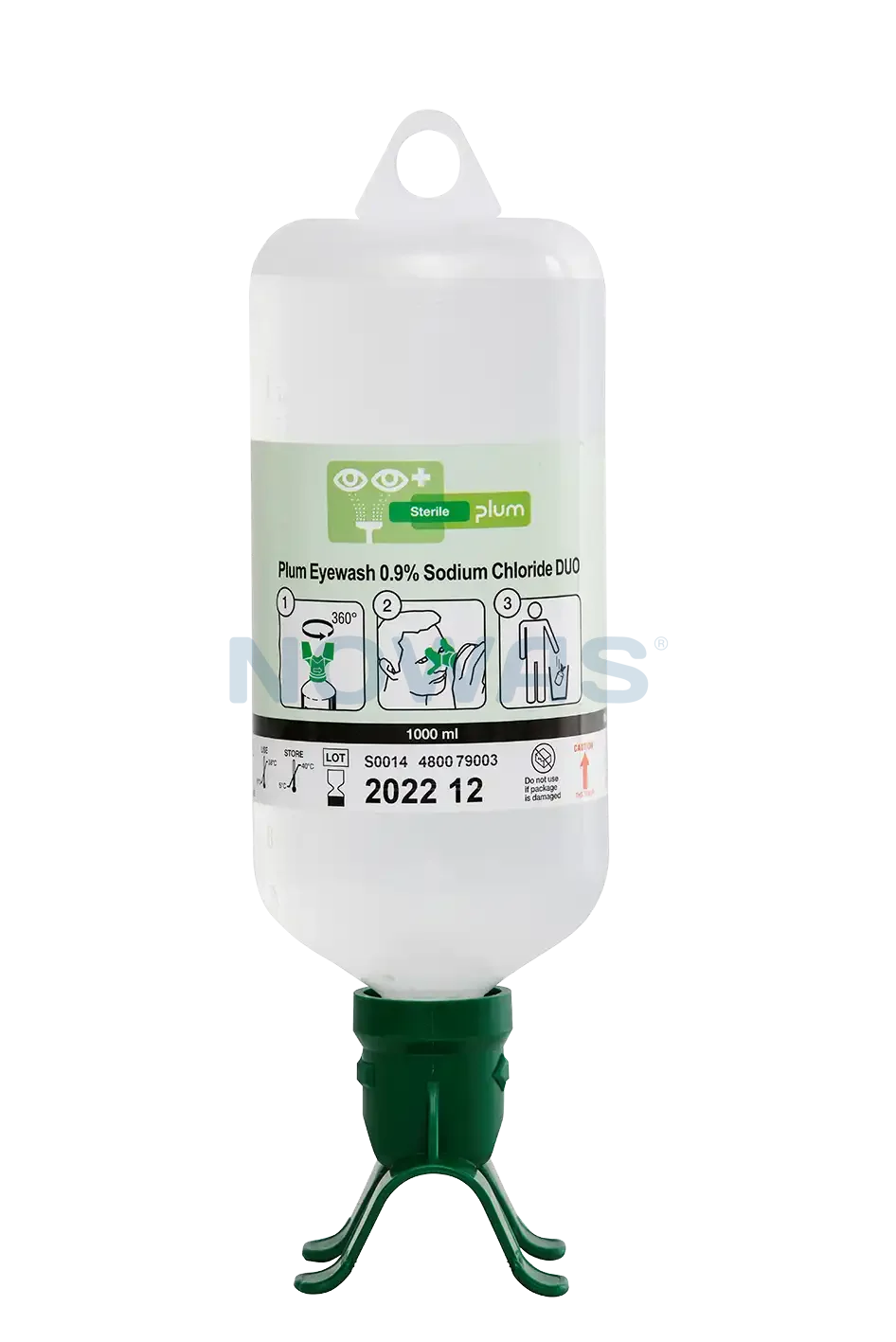 Ögonspolning med Duo-ögonkopp, vilket gör det möjligt att skölja båda ögonen samtidigt. Ergonomiska ögonkoppar ger ett effektivt vätskeflöde. Innehåller 0,9 % steril natriumklorid och används för att skölja ögonen vid olyckor med främmande föremål, damm och smuts. Det är en engångsflaska som inte kan återfyllas.