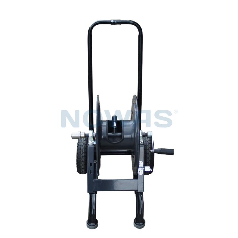 Framtill på vagnen finns två stoppfötter som ser till att den står stadigt och stadigt under användning. Slanghjulet är manuellt upplindat och är gråsvartlackerat.
