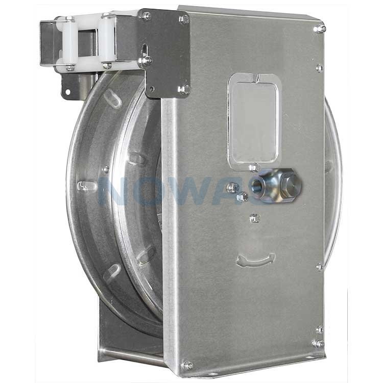 Denna automatiska slangupprullare är tillverkad av rostfritt stål, vilket bidrar till en solid konstruktion och förlänger livslängden. Slangupprullaren har plats för 20 meter DN10-slang.