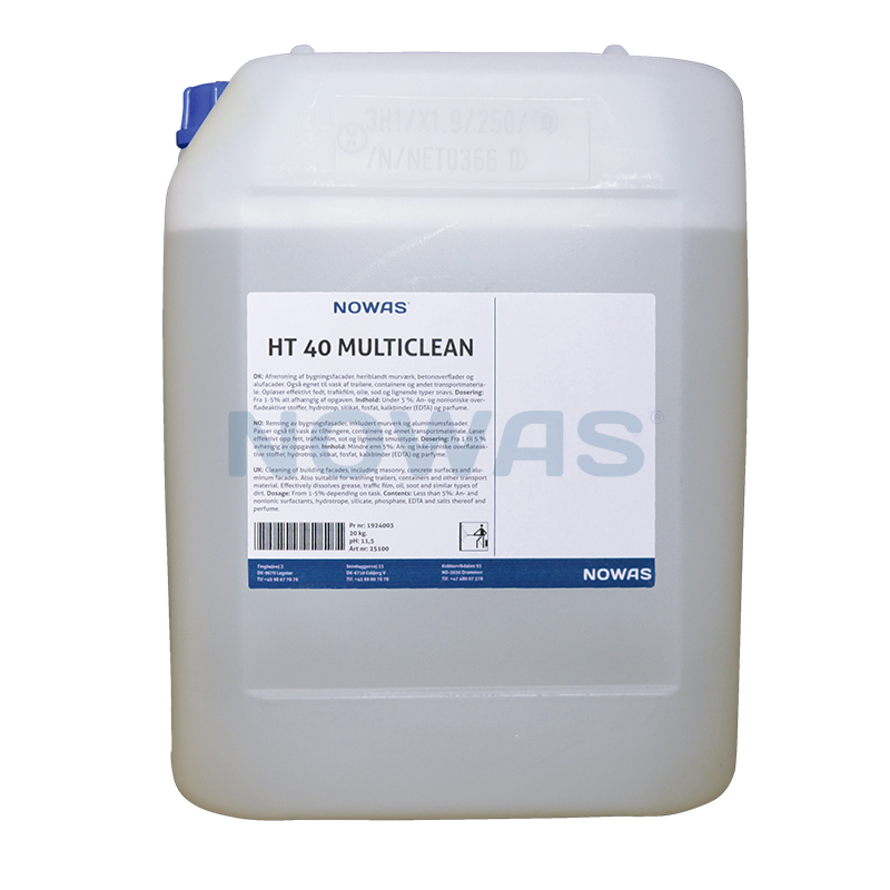 HT 40 Multiclean är ett högkoncentrerat professionellt rengöringsmedel som används för rengöring inom industrin. Lämplig för tvätt och rengöring av byggnadsfasader, containrar, husvagnar, lastbilar och annat transportmaterial. Alkaliskt rengöringsmedel som effektivt löser upp fett och smuts på ytorna. Använd inte på glas. Inte lämplig för bilar.