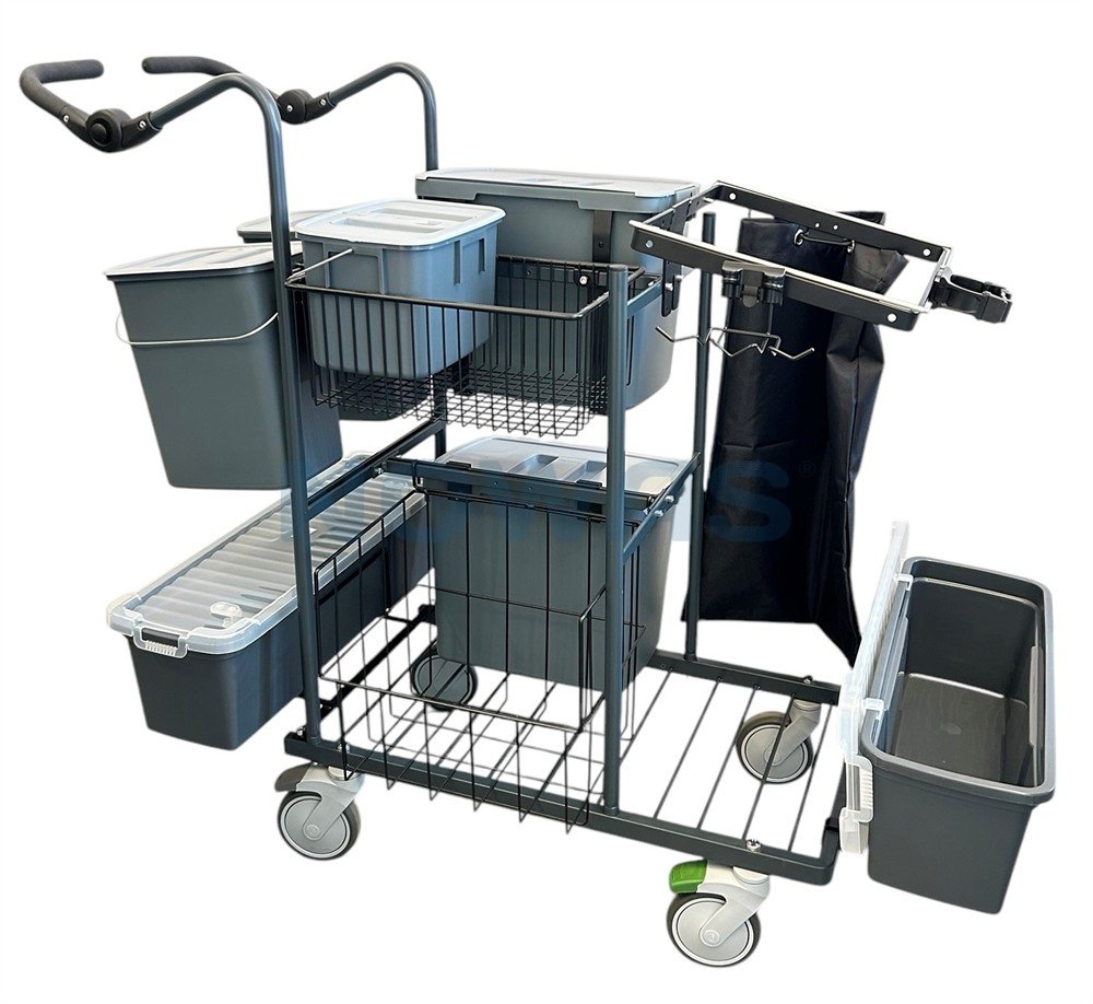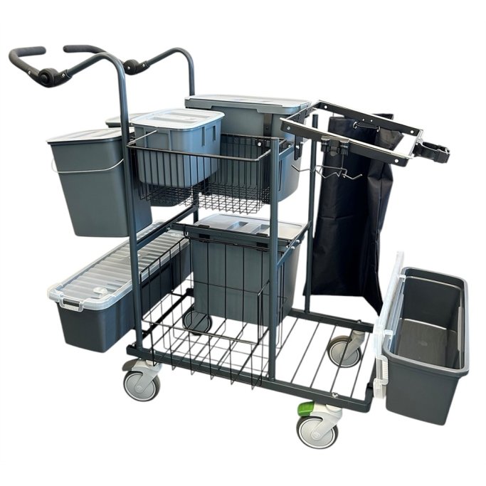 En robust och väl genomtänkt städvagn som kombinerar hållbara material med hög användarvänlighet - ett självklart val för professionella städmiljöer med höga krav på effektivitet och ergonomi.