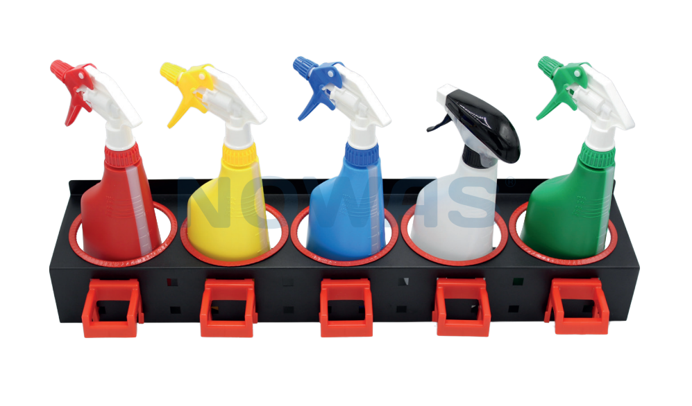 Stativet har 5 hål där du kan sätta i dina sprayflaskor. Dessutom finns det även 5 klämmor där du kan hänga upp 5 sprayflaskor.